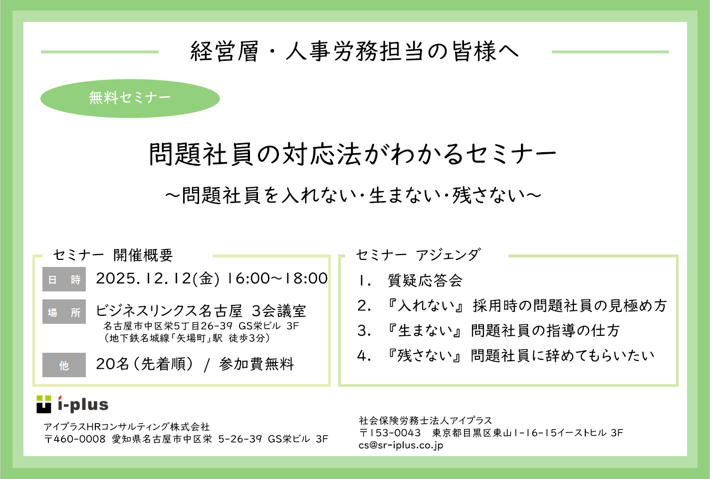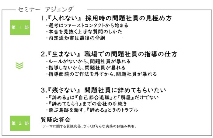 今回はこのような課題を解決する『問題社員』を『入れない』『生まない』『残さない』ための知識とスキルをお伝えするセミナーです。